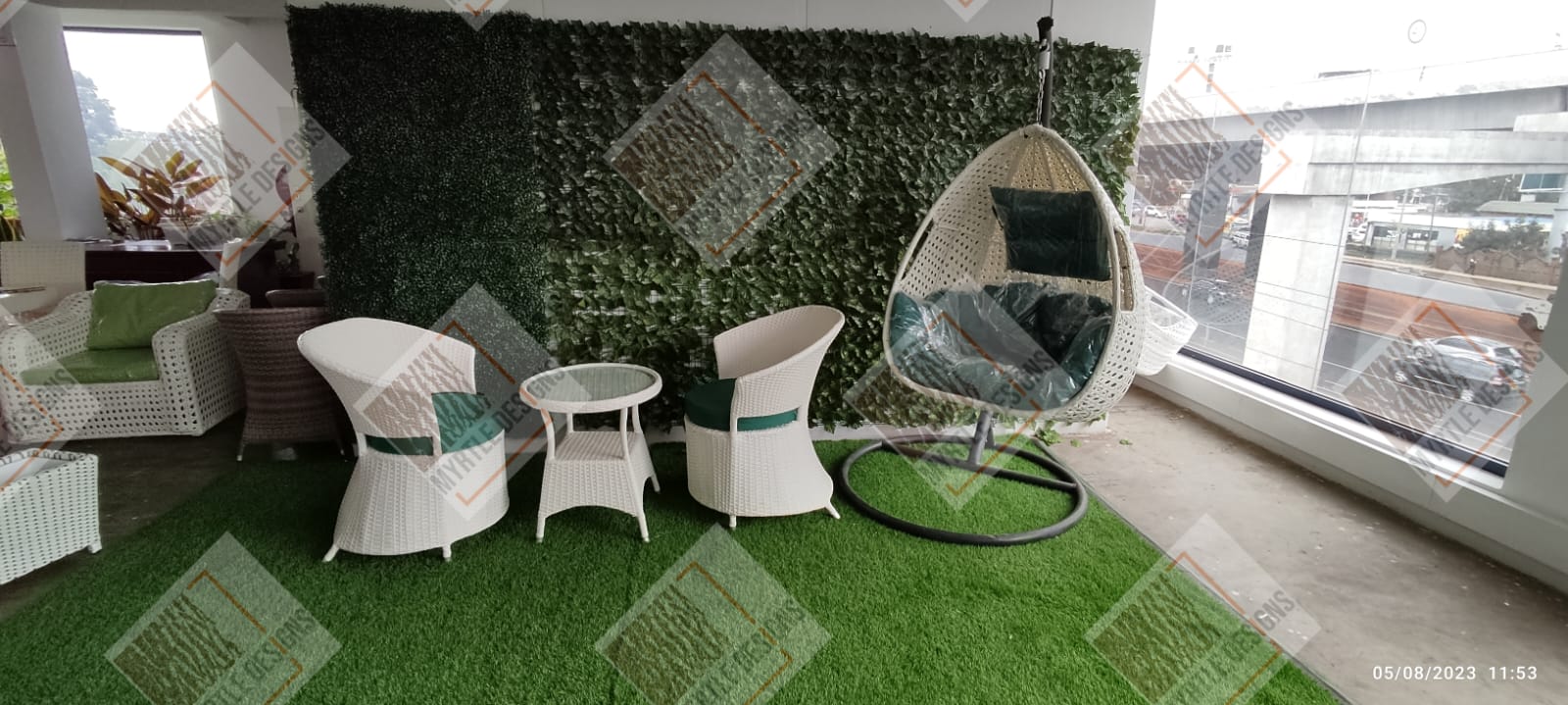 Seats with a table is a minimalist flat weave balcony set with unique and simplified design, coupled with a swing chair to match is a versatile and stylish furniture set designed for small outdoor spaces such as balconies, patios, or deck areas.